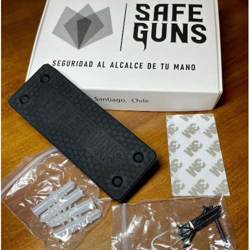 El kit incluye:01 Soporte magnético para armas “SAFE GUNS”.01 Adhesivo doble contacto 3M.04 Tornillos de fijación.04 Tarugos.